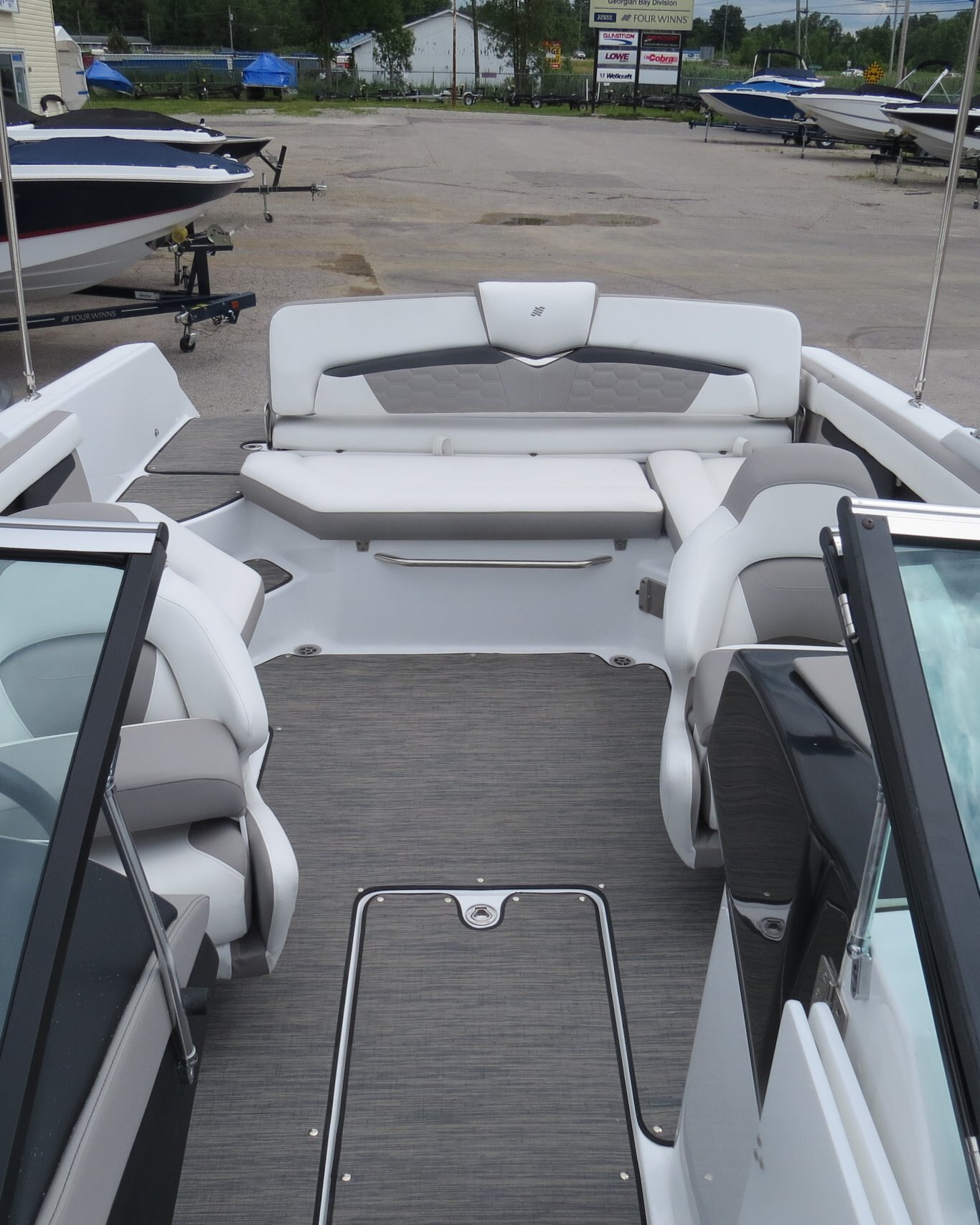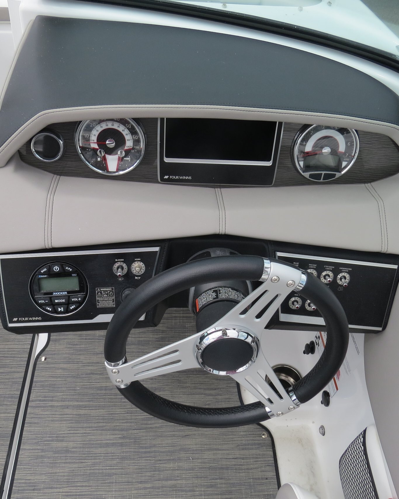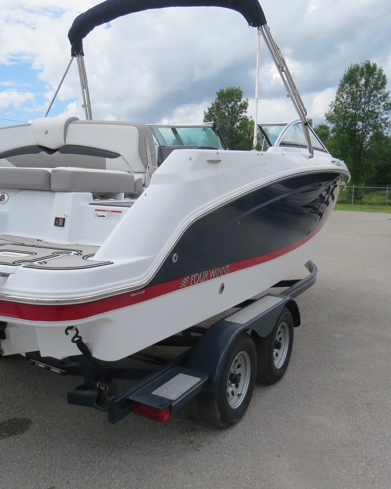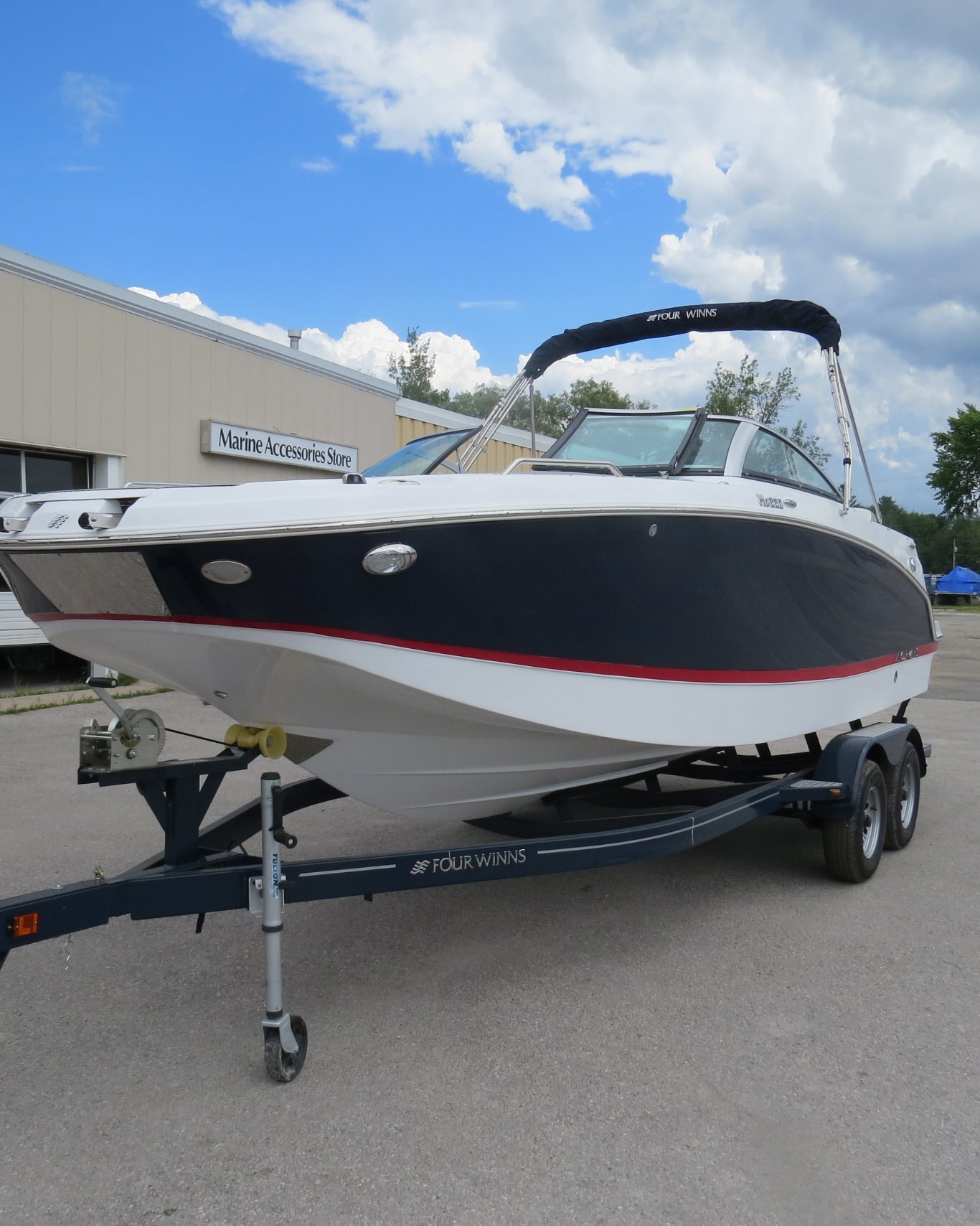 Mercruiser 4.5L/B3 250HP, Cockpit Reed Flooring, Head Pumpout, Flip Up Bolsters, Stainless Steel Cleats, Walk Thru Doors, Bow Fill in Cushions, Garmin GPS, Sirius Radio, Wake Tower with Bimini,  and Custom Matching Four Winns Trailer